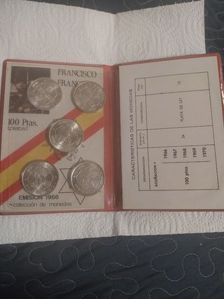 Carterita oficial de la FNMT con las 5 monedas de 100 pesetas de plata de Franco. Estrellas: *66, *67, *68, *69, y *70. Preferible venta en persona para examinar bien el producto, o envíos por correo certificado mediante transferencia ó bizum. No envío Wallapop.