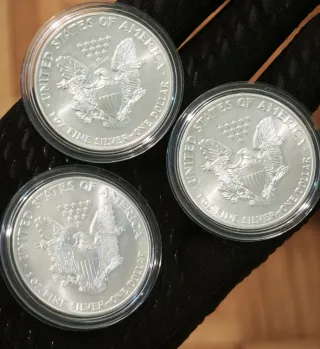 Conjunto de tres onzas de plata American Eagle. - Material plata fina. - Capsulas incluidas. - Moneda de 1986. - Moneda de 1989. - Moneda de 1990.