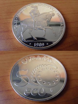 Moneda de plata de 5 ECU del año 1989, conmemorativa de Carlos V. Tiene un peso de 33,62 gramos de plata de 925 mm. o lo que es lo mismo una Onza Troy de Plata Fina (31,10 g.). - Presentada en un expositor de madera. - Incluye certificado de autenticidad. - Diseño de la Unión Europea en la caja.