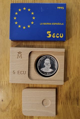 Moneda de plata de 5 Ecu conmemorativa de la Marina Española del año 1995. Se presenta en su estuche de madera y envoltorio de carton. Tiene un peso de 33,62 gramos de plata de 925 mm. o lo que es lo mismo una Onza Troy de Plata Fina (31,10 g.) - Diseño de Don Juan de Austria. - Año de acuñación: 1995. - Valor nominal: 5 Ecu. - Material: Plata.