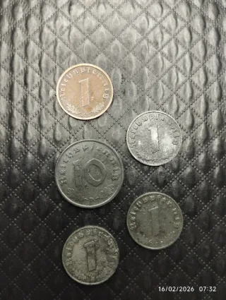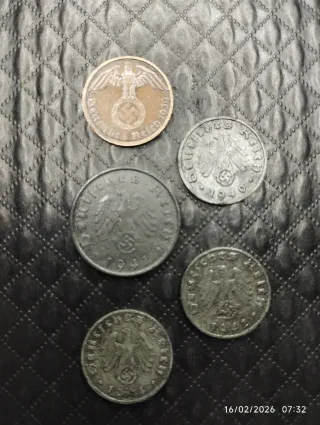Conjunto de monedas antiguas del Tercer Reich. - Moneda de bronce con águila y esvástica, inscrita Deutsches Reich 1939. - Moneda de metal plateado con águila y esvástica, inscrita Deutsches Reich 1940. - Moneda de metal plateado con águila y esvástica, inscrita Deutsches Reich 1941. - Moneda de metal plateado con águila y esvástica, inscrita Deutsches Reich 1942. - Moneda de metal plateado con águila y esvástica, inscrita Deutsches Reich 1943.