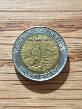 Moneda conmemorativa de 1 peso argentino, edición especial Mar del Plata y Bicentenario. - Diseño con imagen de Mar del Plata. - Grabado Bicentenario en el borde.