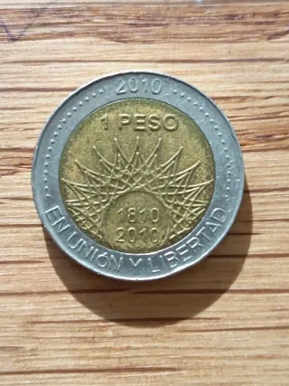 Moneda conmemorativa de 1 peso argentino del año 2010. - Edición especial Bicentenario. - Diseño central: Glaciar Perito Moreno. - Bimetálica: centro dorado y anillo plateado.