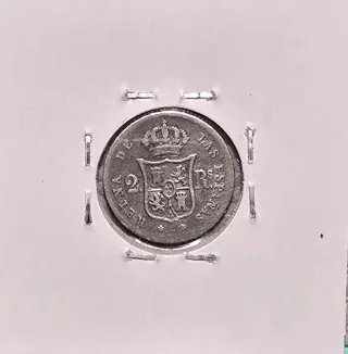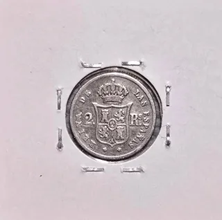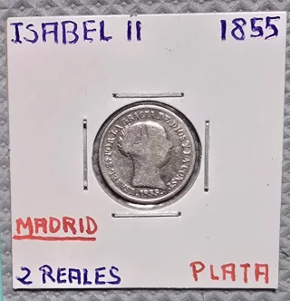 Moneda de plata de 2 Reales de Isabel II, acuñada en Madrid en 1855. - Anverso: Retrato de Isabel II. - Reverso: Escudo o emblema de España. - Año: 1855. - Ceca: Madrid. - Material: Plata.