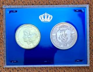 Estuche conmemorativo de las Bodas de Plata de los Reyes de España en 1987. - Incluye dos monedas. - Una moneda muestra los perfiles de los Reyes Juan Carlos y Sofía. - La otra moneda presenta el emblema de las Bodas de Plata con las fechas 1962-1987.