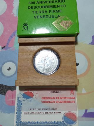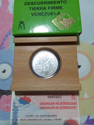 Moneda plata conmemorativa , celebrando el 500 Aniversario del Descubrimiento de Tierra Firme.venezuela - Diseño de la moneda: ESPAÑA 3 EURO - Incluye certificado de autenticidad. - Presentada en estuche de madera.peso 20 gramos plata 925