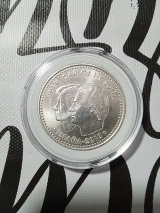 Moneda conmemorativa de plata. - Presenta los perfiles de Juan Carlos I y Sofía. - Grabado ESPAÑA 2010 en la parte inferior. - Incluye estuche protector.