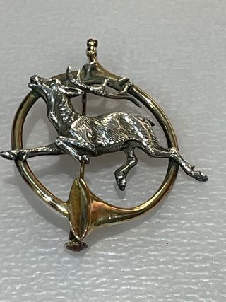 Broche vintage de temática cinegética (caza), con figura de ciervo/corzo en salto en relieve, integrado en una trompa de caza. Pieza bicolor con parte dorada y parte plateada, con marcaje 925 (plata de ley). Características: • Broche de caza / cinegético • Material: plata de ley marcada 925 (zona plateada) • Detalles dorados en trompa • Cierre de aguja • Estado: muy bueno (ver fotografías) • Medidas aproximadas: ver foto con moneda