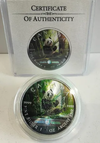 Moneda de plata pura de 1 onza con diseño de panda. EDICION LIMITADA DE 100 UNIDADES,CON CERTIFICADO DE AUTENTICIDAD. - Plata fina .9999 - Diseño de panda en su hábitat natural - Acabado brillante