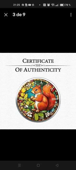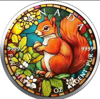 Moneda conmemorativa de Canadá con un diseño detallado de una ardilla sosteniendo una bellota. El diseño imita el estilo de un vitral. - Plata fina .9999 - 1 oz de peso - Diseño de ardilla y bellota - Acabado tipo vitral. -Edicion limitada de 100 unidades,con certificado de autencidad. -Mas monedas en mi perfil
