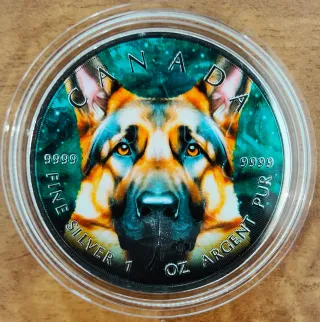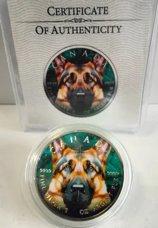 Moneda conmemorativa de Canada con un diseño detallado de un pastor alemán. - Plata fina .9999 - 1 Onza de peso - Diseño de pastor alemán - Acabado brillante -Edicion limitada de 100 unidades,con certificado de autenticidad limitado. -Mas monedas en mi perfil