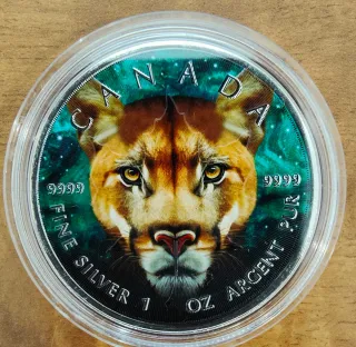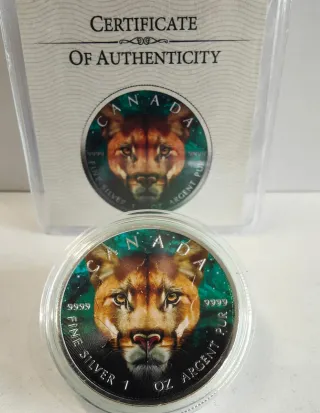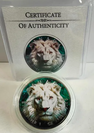 Moneda de plata pura de 1 onza de Canadá, con diseño Wildlife. EDICION LIMITADA DE 100 UNIDADES CON CERTIFICADO DE AUTENTICIDAD. - Plata fina .9999. - Diseño detallado de un león y una hoja de arce. - Acabado colorido y brillante.