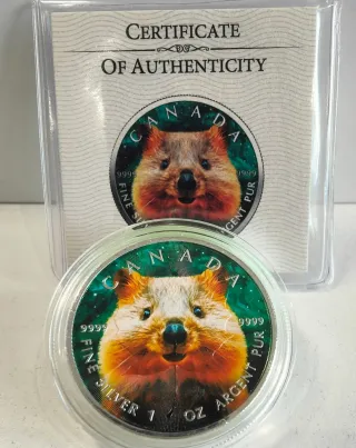 Moneda de plata pura de Canadá con un diseño detallado. - Peso: 1 oz - Pureza: 9999 Fine Silver - País: Canadá - Diseño: Animal (Quokka) -Edicion limitada de 100 unidades, con certificado de autenticidad limitado. -Mas monedas en mi perfil