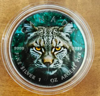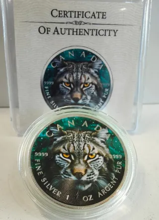 Moneda de plata fina con diseño de lince canadiense. - Plata fina .9999 - 1 oz de peso - Diseño de lince - CANADA grabado - FINE SILVER y ARGENT PUR grabados. -Edicion limitada de 100 unidades,con certificado de autenticidad limitado. -Mas monedas en mi perfil