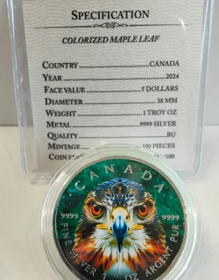 Moneda de colección de Canadá. - Plata pura 9999. - Peso de 1 oz. - Diseño detallado de un águila. - Acabado brillante. -Edicion limitada de 100 unidades, con certificado de autenticidad numerado. -Mas monedas en mi perfil