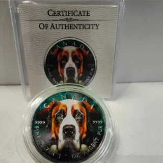 Moneda de colección de Canadá con un diseño detallado de un San Bernardo. - 1 Onza de Plata Pura. - Pureza de 9999. - Diseño de perro San Bernardo. - Inscripción CANADA y FINE SILVER 1 OZ ARGENT PUR. -Edicion limitada de 100 unidades,con certificado de autenticidad numerado. -Mas monedas en mi perfil