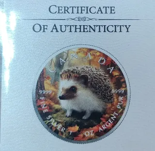 Moneda de plata pura de Canadá con un diseño de erizo. EDICION LIMITADA DE 100 UNIDADES,CON CERTIFICADO DE AUTENTICIDAD NUMERADO. - Plata fina .9999 - 1 Onza de peso - Diseño detallado de erizo - Reverso con texto 'CANADA' y 'FINE SILVER 1 OZ ARGENT PUR' - Anverso con número de pureza '9999'