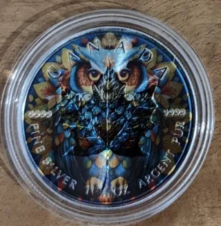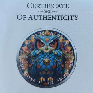 Moneda de plata fina de 1 onza de Canadá con un diseño detallado de un búho y una hoja de arce. - Plata fina 9999. - Peso: 1 oz. - País: Canadá. - Diseño: Búho y hoja de arce. -Edicion limitada de 100 unidades, con certificado de autenticidad numerado. -Mas monedas en mi perfil