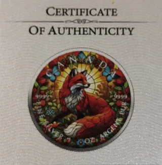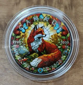 Moneda conmemorativa con un diseño detallado de un zorro y mariposas, inspirada en vitrales. - Plata de ley 9999. - Diseño artístico con colores vibrantes. - Acabado de alta calidad. -Edicion limitada de 100 unidades, con certificado de autenticidad numerado. Mas monedas en mi perfil.