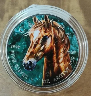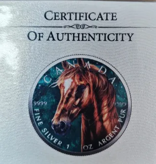 Moneda de plata fina de 1 onza, con pureza de 9999. Presenta un diseño detallado de un caballo. - Pureza: 9999 - Peso: 1 oz - Material: Plata fina - País: Canada -Edicion limitada de 100 unidades, con certificado de autenticidad numerada. -Mas monedas en mi perfil
