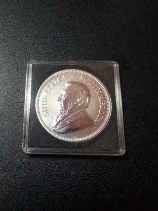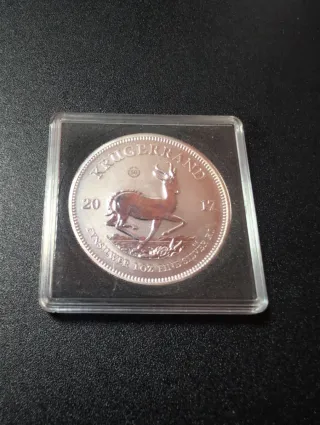 Moneda de plata Krugerrand de 1 onza fina, con fecha de 2017. - Diseño de antílope saltando. - Inscripción Krugerrand en la parte superior. - Inscripción Fine Silver 1oz en la parte inferior.