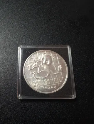 Moneda de plata con diseño de panda. - Material: Plata. - Denominación: 10 Yuan. - Pureza: 999. - Año: 1989