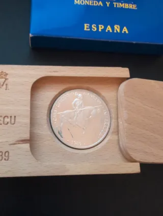 Presentamos una moneda de 5 ECU de España, acuñada en el año 1989. Viene en su caja original de Moneda y Timbre y un estuche de madera. - Moneda de 5 ECU. - Año de acuñación: 1989. - País: España. - Material: Plata.