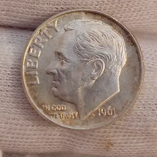Moneda de plata de Estados Unidos, año 1961. - Diseño de Franklin D. Roosevelt. - Inscripción IN GOD WE TRUST.