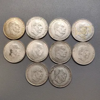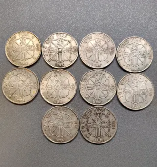 Precio no negociable. Lote 10 Monedas 100 Pesetas Plata (Franco) - Años 1966, 1967, 1968 muy buscadas por coleccionistas. Material: Plata de Ley 800‰ Peso Bruto: 19 gramos por moneda. Peso total: 190 gramos. Acuñaciones Incluidas 7x Año 1966 (Estrella 66). 1x Año 1966 (Estrella 67). 2x Año 1966 (Estrella 68). Perfectas para inversión o colección. El precio se irá actualizando según valores del mercado.