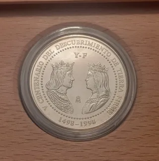 Moneda 3 euros de plata del año 1998. Conmemorativa del 500º aniversario del Descubrimiento de Venezuela. Con estuche y certificado original FNMT. Sin Circular. UNC. Época Juan Carlos I. También envío por correo ordinario (desde 1 euro) y certificado asegurado (desde 5 euros).