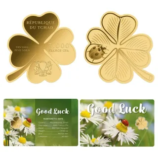 🚩 HAGA UN REGALO ESPECIAL 👉 MONEDA DE ORO 1/1000 OZ 24K (0.0311g) Esta encantadora moneda de Oro presenta un gran símbolo de buena suerte: el trébol. Sirve como talismán y recordatorio de que todos pueden dominar su propio destino y crear su propia suerte. Esta moneda de Oro está bellamente empaquetada en un blister, con el Certificado de Autenticidad incorporado en su parte trasera. El reverso muestra un trébol de 4 hojas, con una encantadora mariquita sobre una de sus hojas. El anverso muestra el Escudo de Armas de Chad. * lince ibérico, toro, caballo cartujano, águila imperial, oso pardo, plata, panda, libertad, koala