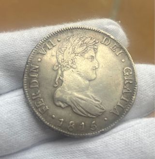 Moneda de 8 Reales de Guatemala acuñada en el año 1815. Presenta el busto de rey con laureles y la inscripción FERDIN. VII DEI GRATIA en el anverso. - Año: 1815 - Ceca: Guatemala - Metal: Plata