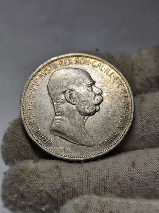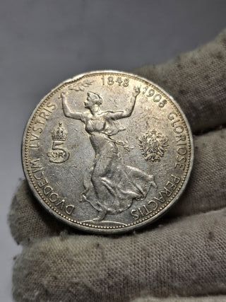 Características Emisor: Imperio austríaco (Austria) Emperador: Francis Joseph I (Franz Joseph I) (1848-1916) Tipo: Monedas circulantes normales Año: 1908 Valor: 5 Crowns (5 Kronen) Unidad monetaria: Corona (1892-1918) Composición: Plata Peso: 24 g Diámetro: 36 mm Grosor: 2,6 mm