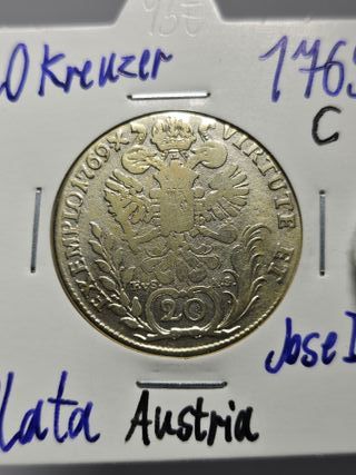 Características Emisor: Imperio austríaco (Austria) Regente: José II (1765-1780) Tipo: Monedas circulantes normales Año: 1769 Valor: 20 Kreuzers (1⁄3) Unidad monetaria: Gulden (1754-1857) Composición: Plata Peso: 6,68 g Diámetro: 29 mm