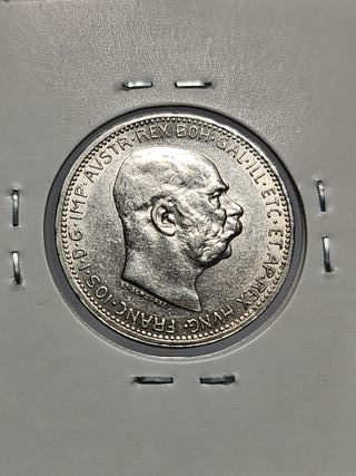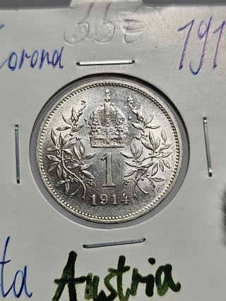 Características Emisor: Imperio austríaco (Austria) Emperador: Francis Joseph I (Franz Joseph I) (1848-1916) Tipo: Monedas circulantes normales Año: 1914 Valor: 1 Crown (1 Krone) Unidad monetaria: Corona (1892-1918) Composición: Plata Peso: 5 g Diámetro: 23 mm Grosor: 1,5 mm