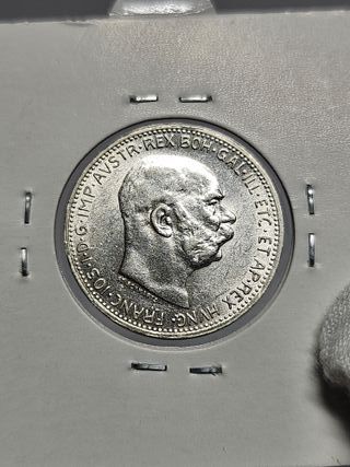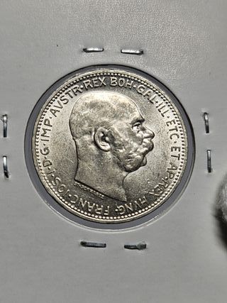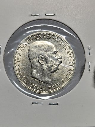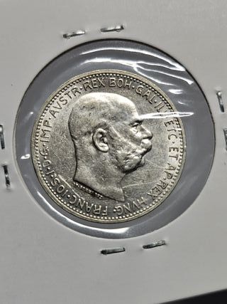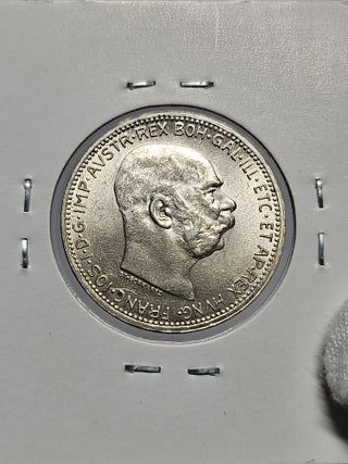 Características Emisor: Imperio austríaco (Austria) Emperador: Francis Joseph I (Franz Joseph I) (1848-1916) Tipo: Monedas circulantes normales Años: 1912 Valor: 2 Crowns (2 Kronen) Unidad monetaria: Corona (1892-1918) Composición: Plata Peso: 10 g Diámetro: 27,1 mm Grosor: 2 mm