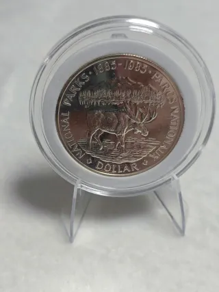 Moneda conmemorativa de 1 dólar de Canadá de 1985, dedicada a los Parques Nacionales. - Acabado en plata. - Diseño de alce y paisaje montañoso. - 23,3 gramos de plata 500