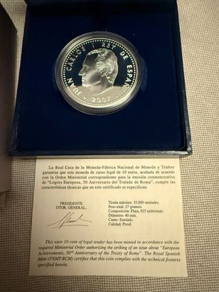 Preciosa moneda de plata conmemorativa del 50 aniversario del Tratado de Roma. Se encuentra en perfecto estado, dentro de su estuche original y con certificado de autenticidad. - Moneda de 10 euros. - Edición limitada. - Incluye estuche y certificado.
