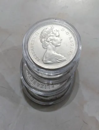 4 Monedas de Canadá de 1 Dólar conmemorativa del aniversario de 1964 y 1965. Presenta el retrato de la Reina Isabel II. - Lote de 4 monedas de fina plata (93,33g) - Estado impecable sin circulación. - Diseño detallado. - En perfecto estado *SC* No leer; 5 pesetas inversión spot duros España Austria Bélgica Alemania EE.UU dólar máxima calidad oro platino lingote 1 2 3 4 5 6 7 8 9