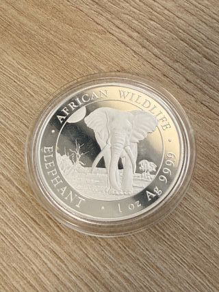 Moneda de plata con diseño de elefante africano. - Peso: 1 oz - Pureza: .999 plata - Diseño: Elefante africano en paisaje natural