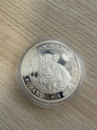 Moneda de plata de colección con diseño de leopardo africano. - Peso: 1 oz (onza troy). - Pureza: .999 plata fina. - Serie: African Wildlife. - Diseño: Leopardo.