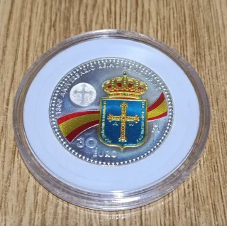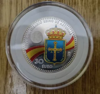 Moneda conmemorativa de plata de 30 euros de España, acuñada en 2018. TIENE ALGUNAS MANCHITAS EN LA PARTE DONDE ESTÁN LOS ROSTROS DEL REY Y DE LA PRINCESA (como se puede apreciar en la foto). - Diseño del Reino de Asturias. - Incluye escudo y corona. - Detalle de la Cruz de la Victoria.