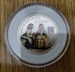Moneda de plata de 30 euros de España del año 2019, dedicada al Museo del Prado. - Diseño inspirado en la obra Las Meninas de Velázquez. - Dentro de una cápsula (la de la foto)