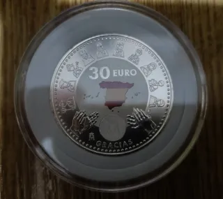 Moneda de España del año 2020 dedicada a los héroes de la pandemia. Dentro de una cápsula (la de la foto). - Valor nominal de 30 euros. - Fabricada en plata. - Diseño con mapa de España y figuras. - Inscripción GRACIAS.
