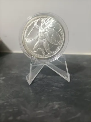 Moneda de plata .999 de 1 onza con diseño de Thor de Marvel. - Material: Plata pura .999. - Peso: 1 onza (aproximadamente 31.1 gramos). - Diseño: Personaje Thor de Marvel Comics.
