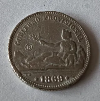 Moneda de plata de 1 punto del Gobierno Provisional. 3,54 grs de peso 23 mm diámetro - Año: 1869 - Diseño: Figura sentada con rama y corona - Inscripción: GOBIERNO PROVISIONAL En buen estado Se hacen lotes