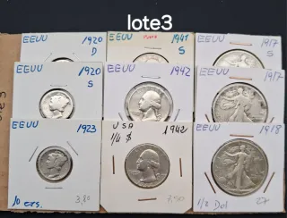 Lote de 9 monedas de plata de Estados Unidos (EEUU). Plata 900 3- medio dolar 3- cuarto dolar dola 3- dime - Monedas de diferentes años - Incluye monedas de 1917, 1918, 1920, 1923, 1941, 1942. - Algunas monedas tienen la marca 'S' o 'D'. Todas bien protegidas Se envían las de las fotos