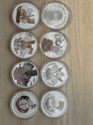 Conjunto de monedas de colección de plata .999 de 1 onza, con diseños de Los Simpson. - Diseño de Bart Simpson con patineta. - Diseño de Homer Simpson con dona. - Diseño de Krusty el Payaso. - Diseño de Bart Simpson. - Diseño de Season's Greetings con personajes. - Diseño de la familia Simpson.