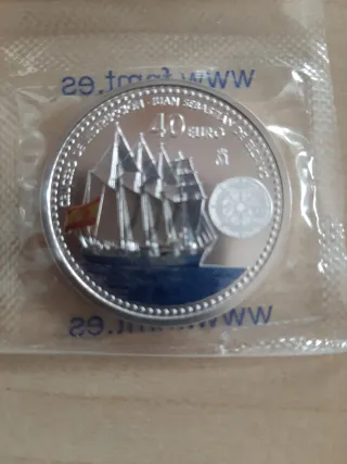 Moneda conmemorativa de plata con valor de 40 euros. - Diseño del barco Juan Sebastián Elcano. - Acabado en plata.