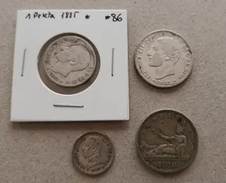 Conjunto de cuatro monedas de plata, incluyendo piezas de Alfonso XII y de España. - Moneda de 1 Peseta de 1885. - Moneda de 2 Pesetas de 1882. - Moneda de 2 Pesetas de 1870. - Monedas 50 céntimos de Peseta de 1910. - Más billetes y monedas en mi perfil.